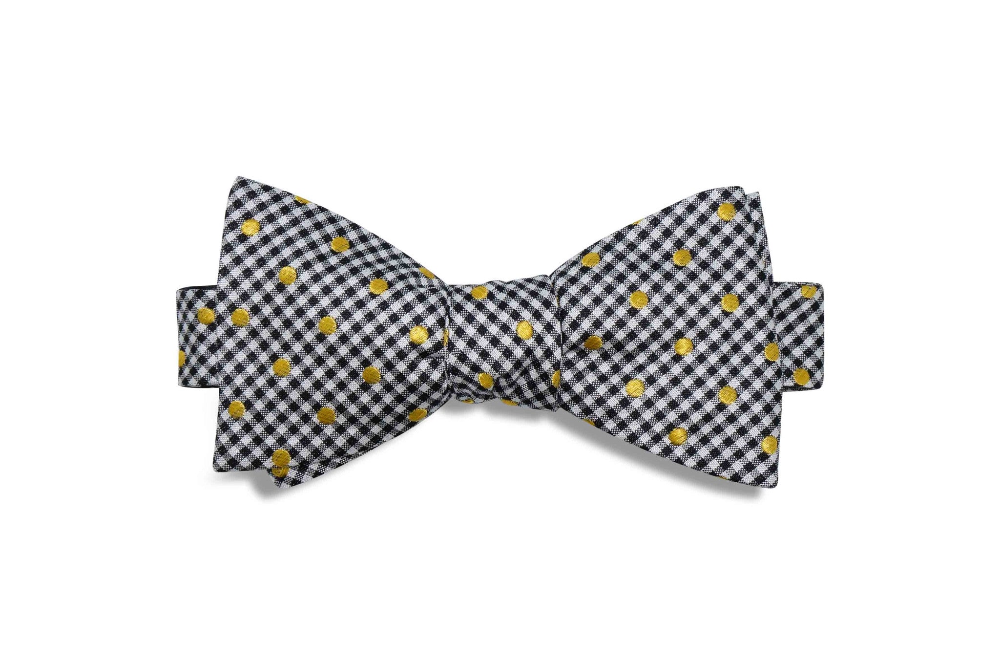 These black and white checkered silk self-tie bow ties have golden polka dots.